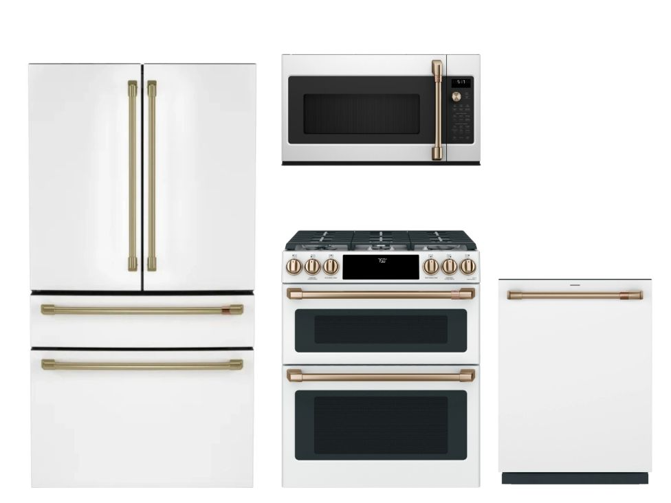 Café™ 4 Piece Matte White Kitchen Package with a french door refrigerator, slide in double oven gas range, built in dishwasher and over the range microwaveRead More