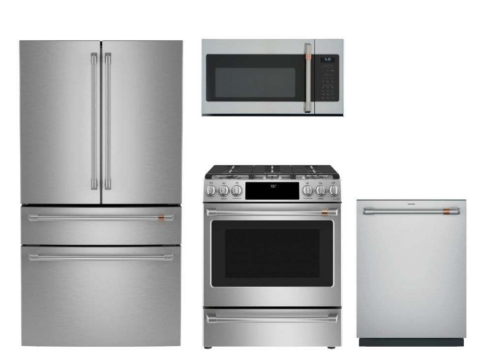 Café™ 4 Piece Stainless Steel Kitchen Package with a french door refrigerator, slide in gas range, built in dishwasher and over the range microwaveRead More